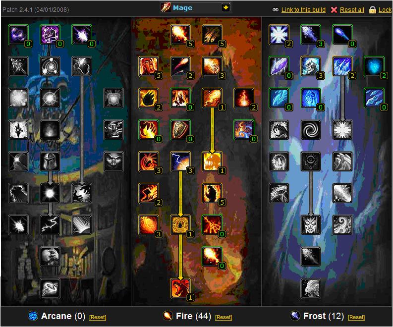 | кстати Zeka, по поводу твоего билда пару слов, на внете на мой взгляд самый фарт для бг так это аркан/фаер аркан до арканы павера и фаер на сколько влезет, в основном билд на пом пиро под ап. вот примерные билды, делал с учетом внета =D Аркана/фаер билд а по поводу фаер рулит или нет...нет у тебя живучести, тем более на 60-69 бг где ресайленса так же нет, НО...1 место по килам и дмг ?????? хых на внете может это и так, но на рабочем сервере, наример офф )))) фаер мага быстрее убьют чем он успеет откастить по всем кд, арену не берем, тут на фаер магу вооообще на мой взгялд нечего делать )))) тебе все равно под фаер билдом придется входить в мили зону для каста БВ и ДБ а если ДБ еще и срезиститься то получаем и получаем ))) будешь выходить блинком или под новой, опять кд спустишь и скорее будешь получать ибо абилки на кд.. я не знаю что там работает во фросте, но знаю такую вещь, под клиркастом и айс венисом фрост болты летят ой ой ой как + под нову и колд шнапом на элема и на тод же айс венишь =D наешь бешаный дмг одними инстантами с ланса когда ланс в 2к а у тебя есть колд снап и нова эоема.....вообщем, фаер - пве билд все знают...но внет сцука такой серв =D так что юзаем все аркан фаер билд...ну или фаер фрост...хотя я не понимаю, Зека ты наверное в 99% случаев бегаешь под мулти армором, и фрост болтами пользуешься редко и тратить 7 талантов ради ИФрост новы.....еще и вкачивая талант фрост вердинг....это на серваке что эра фрост магов ? ) кидай лучше не во фрост а в акркану, хотябы до клиркастинга